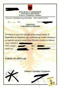 -Vërtetimi i dënimit realizohet nga Kartoteka e DPBSH-së, e cila disponon regjistrat me listat përkatëse të personave të dënuar apo ish- të denuar. Ky dokument lëshohet vetëm me firmën e Drejtorit të Përgjithshëm.