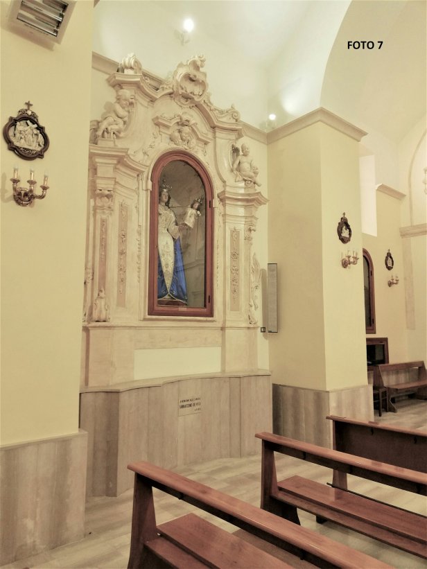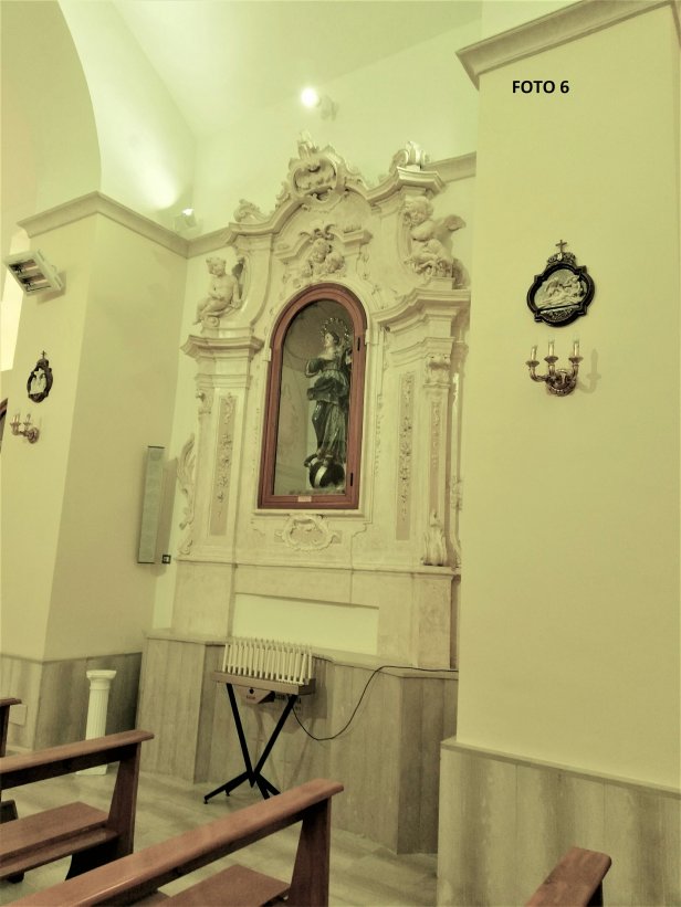 Nella zona immediatamente prima dell’altare, sulle pareti laterali, ci sono due bellissimi altari (foto 6-7) finemente decorati in stile barocco con ricami floreali e angelici. Nel 1977 le parti inferiori degli altari sono state modificate e rivestite con lastre in marmo.