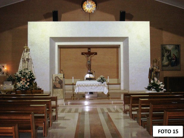 L’altare principale è caratterizzato da una cornice che richiama l’attenzione del fedele verso la mensa. Nella parete delimitata dalla cornice trova posto un crocifisso in legno.
