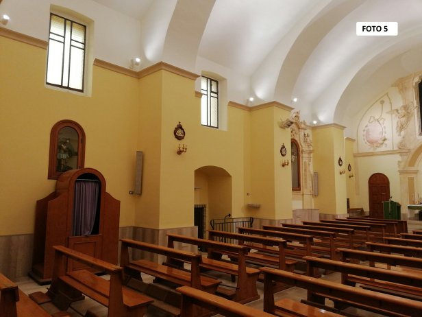 L’interno (foto 5) si presenta ad aula unica a pianta rettangolare con massicce colonne che rompono la continuità dei muri laterali. La volta è a botte con degli archi a vista a tutto sesto. Il pavimento originario è andato perduto perché sostituito da quello attuale nel 1977. Lungo la parete di sinistra c’è una porta laterale che conserva una parte del pavimento originario. Sulle pareti laterali dell’edificio, nel corso degli anni sono state realizzate delle nicchie che ospitano numerose statue legate alla devozione e alla pietà popolare.