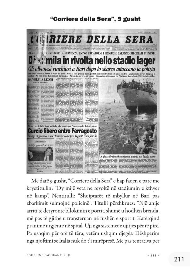 ” …Ngjarjet e gushtit të vitit 1991 në portin e Barit dhe gjithë Italinë janë epokale për nga përmasat, për nga fenomeni, ndaj për t’i kuptuar më mirë, jam bazuar në artikujt e së përditshmesh italiane ‘Corriere della Sera’ të datës 7 gusht deri më 14 gusht. Kanë kaluar shumë vjet që kur shqiptarët thyen izolimin e një regjimi mizor për të marrë rrugët drejt brigjeve italiane, si një mundësi për t’u larguar për një jetë më të mirë, por edhe si simbolikë për të fituar një ndër liritë themelore që u ishte mohuar për thuajse 40 vjet, për të lëvizur të lirë drejt mundësive të reja. Duke qenë se kanë kaluar shumë vjet, ata që i kanë përjetuar drejtpërdrejtë ato ngjarje ose nuk i kujtojnë më, ose janë bërë qytetarë italianë e janë në pension apo në prag pensioni; disa të tjerë nuk jetojnë në Itali, ndoshta janë kthyer në Shqipëri ose kanë emigruar në ndonjë shtet tjetër perëndimor. Sigurisht, tashmë në një gjendje të mirë sociale, ata ose i kanë harruar ato kujtime si pjesë e një botë që nuk ekziston, ose përpiqen t’i harrojnë duke menduar më nostalgji e duke përjetuar me krenari arritjet e tyre pas një procesi të gjatë dhe të vështirë të integrimit në vendet ku u stabilizuar për të ndërtuar të ardhmen e tyre dhe të pasardhësve të tyre. Ndërsa disa të tjerë, të lindur më vonë në Itali, i përkasin brezit që nuk i kanë përjetuar ato ngjarjen, ndoshta thjeshtë i kanë dëgjuar si histori…”.